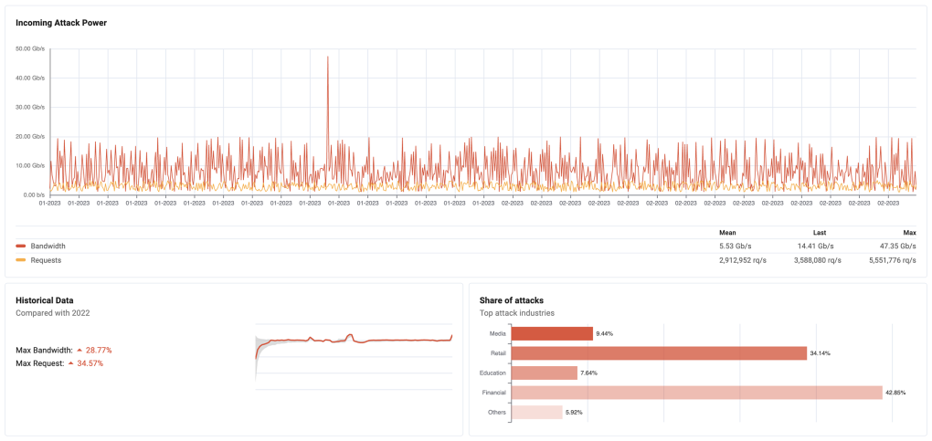 Chuyên gia của Vnetwork cho biết có những cuộc tấn công quy mô lớn lên đến 5,6 triệu request mỗi giây. Các cuộc tấn công này chủ yếu vào tầng ứng dụng (Layer 7). Ngoài ra, có khách hàng bị tấn công hơn 47 Gbps vào Layer 3 và 4. So với cùng kỳ 2022, số lượng các cuộc tấn công tăng hơn 10% và tăng hơn 25% về quy mô.
